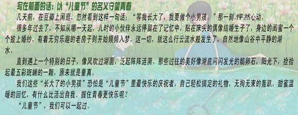 必須承認(rèn)每個(gè)人的內(nèi)心其實(shí)都有一些“童年”情結(jié),我們有太多的理由去懷念那一去不復(fù)返的美好時(shí)光,那些記憶里的彩漆積木、玻璃珠和永遠(yuǎn)也舍不得貼的不干膠……不是孩子,就失去了過(guò)兒童節(jié)的權(quán)利了嗎?當(dāng)然不是!【我要過(guò)節(jié)】 |