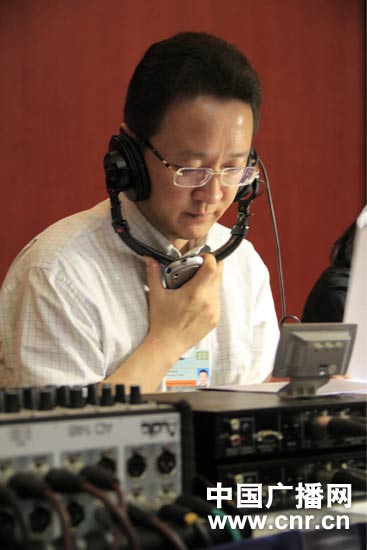 中央臺(tái)總編室新聞宣傳管理處處長(zhǎng)劉磊在審聽直播前試音
