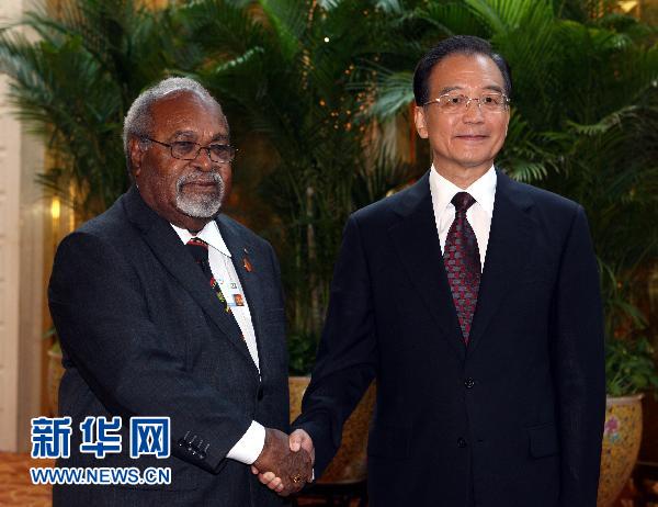 在會(huì)見(jiàn)索馬雷時(shí),溫家寶首先祝賀巴新獨(dú)立35周年,相信巴新將在經(jīng)濟(jì)社會(huì)發(fā)展方面取得更大成就。溫家寶表示,中國(guó)政府鼓勵(lì)本國(guó)企業(yè)擴(kuò)大對(duì)巴新投資,加強(qiáng)在農(nóng)林漁業(yè)、能源資源、電信交通等重點(diǎn)領(lǐng)域的合作。作為太平洋島國(guó)的朋友和伙伴,中國(guó)愿繼續(xù)提供力所能及的援助,促進(jìn)本地區(qū)的發(fā)展。
