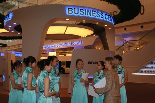 2010夏季達(dá)沃斯(新領(lǐng)軍者年會)9月13-9月15日在天津舉辦,主題為“推動可持續(xù)增長”。作為夏季達(dá)沃斯官方網(wǎng)絡(luò)媒體合作伙伴和官方互動平臺,騰訊財經(jīng)對本次論壇進(jìn)行全程網(wǎng)絡(luò)直播。圖為達(dá)沃斯新領(lǐng)軍者村內(nèi),禮儀小姐正在接受領(lǐng)隊培訓(xùn)。