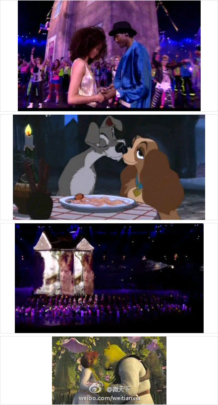 她,頭發(fā)蓬松,手如柔荑,膚如凝脂;他,頭戴禮帽,儀表堂堂,愛意滿倉;兩人緩緩從人群中走向?qū)Ψ,嬌羞,強忍,擁吻,融化。大屏幕適時放出影史經(jīng)典吻戲,從休-格蘭特到史萊克,從一見鐘情到厚積薄發(fā);若我知如何舍棄你,那該多好。這么確切的愛,一生只有一次。
