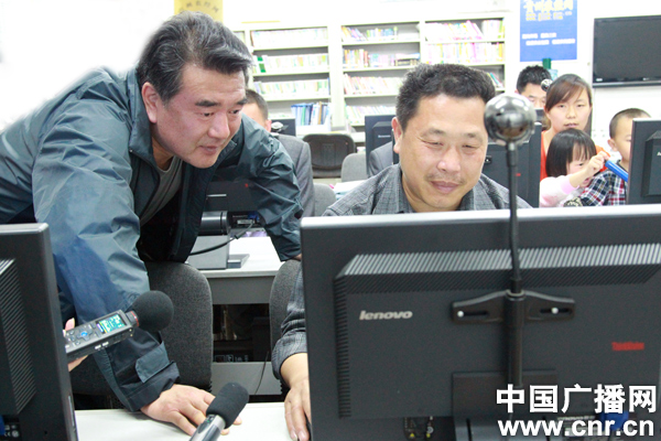 4月26日晚記者(左)在貴州湄潭縣核桃壩村多功能信息服務(wù)站采訪,村民秦賢良(右)告訴記者他正在通過網(wǎng)絡(luò)視頻學(xué)習(xí)農(nóng)業(yè)技術(shù)(中廣網(wǎng)記者 涂傲 攝)
