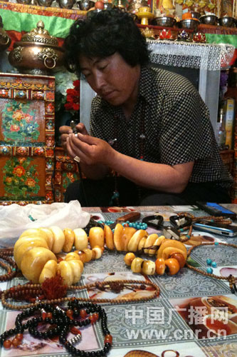 “茶”過(guò)三旬,他從柜子里把自己的“商品”拿出來(lái)攤在桌子上,然后如數(shù)家珍的向我們介紹:這是蜜蠟,多少錢一克;那是菩提佛珠,少了多少錢不賣;這種藏刀是牛骨的刀柄、銀子的刀鞘……經(jīng)過(guò)詢價(jià)和比較,發(fā)現(xiàn)成色基本一樣的東西在康珠家果然要便宜三分之一左右,接著,康珠現(xiàn)場(chǎng)為我們展示了手鏈的制作過(guò)程:首先,他從柜子里掏出七八樣工具,有小電鉆、各種尺寸的刻刀、一大包各種材料的手鏈繩、搭配用的小珠子、白銅質(zhì)地的小配飾……然后,他開始在珠子上鉆眼、打磨,然后穿繩,一遍穿一遍跟我們說(shuō):“這個(gè)珠子配上好看”、“這個(gè)石頭好,在別的地方找不到!备屛覀兂泽@的是,康珠那雙看起來(lái)又粗又壯的大手,在編手鏈、打結(jié)的時(shí)候卻零活無(wú)比,手指翻動(dòng),一個(gè)中國(guó)結(jié)就打好了,聽著我們的吃驚和夸獎(jiǎng)聲,這個(gè)康巴漢子笑紅了臉,但是依然驕傲的說(shuō)“我這個(gè)沒(méi)人教,都是看看這個(gè)人,看看那個(gè)人,自己就會(huì)了”。喝飽了茶,康珠把我們一路送到出租車上。路上,王昭朋告訴我,隨著西藏旅游業(yè)的快速發(fā)展,轉(zhuǎn)行做小生意的農(nóng)民很多,像康珠這樣從外地來(lái)拉薩謀生的人更是越來(lái)越多。堅(jiān)韌的性格、不怕吃苦的精神和善良厚道的特點(diǎn),使康珠這樣的藏族同胞不僅樹立了口碑,還結(jié)交了很多朋友,生意越來(lái)越好做,日子也過(guò)的越來(lái)越好。
