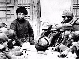 1945年10月11日,毛澤東飛返延安時,在重慶機場與送行的張治中、陳誠、陶行知等合影 1947年初,為粉碎國民黨軍胡宗南部對陜甘寧邊區(qū)的進攻,延安召開保衛(wèi)陜甘寧邊區(qū)動員大會,圖為毛澤東赴會途中 圖為毛澤東在小河村