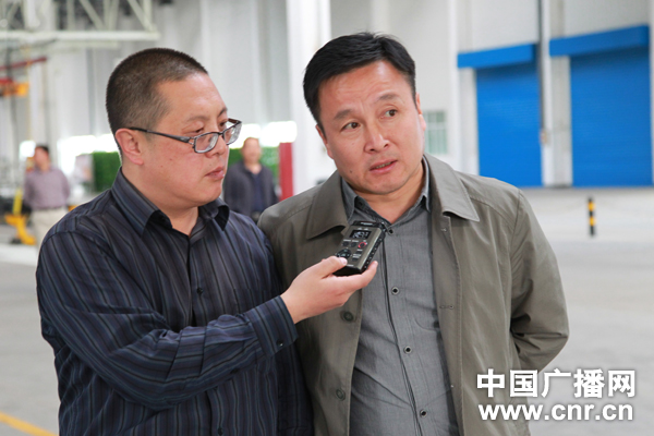 中央臺(tái)《傾聽新疆》采訪團(tuán)成員,中央臺(tái)記者張雷(左)在陜汽新疆汽車有限公司采訪