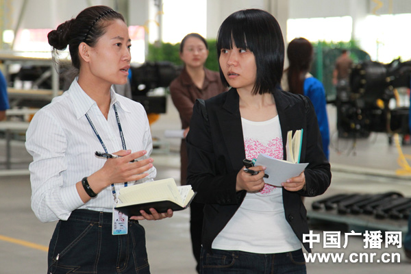 中廣網(wǎng)記者朱虹(右)在“傾聽(tīng)新疆·走轉(zhuǎn)改”采訪中與陜汽集團(tuán)的工作人員進(jìn)行交流