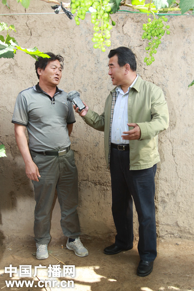 中央臺(tái)臺(tái)長王求(右)5月12日以普通記者身份參加“傾聽新疆·走轉(zhuǎn)改”采訪活動(dòng),圖為記者在榆樹溝鎮(zhèn)林果業(yè)示范基地采訪果農(nóng)孫紅滿
