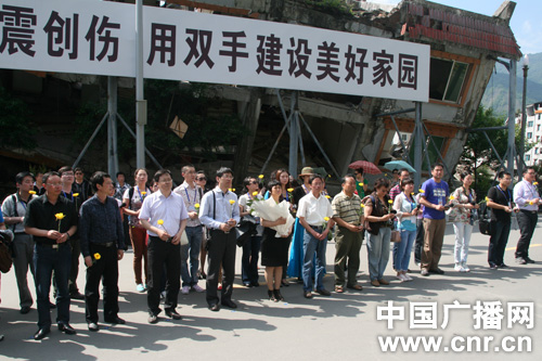 全國百家電臺走轉(zhuǎn)改報道團在北川地震紀念碑前獻花