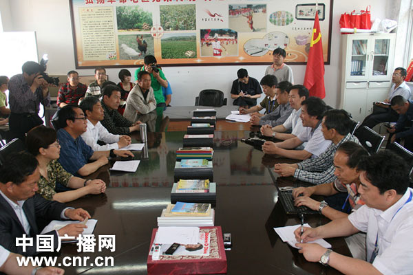 武鄉(xiāng)縣相關(guān)負責(zé)人在磚壁村向采訪團介紹當(dāng)?shù)厍闆r (中廣網(wǎng)記者董浩攝)
