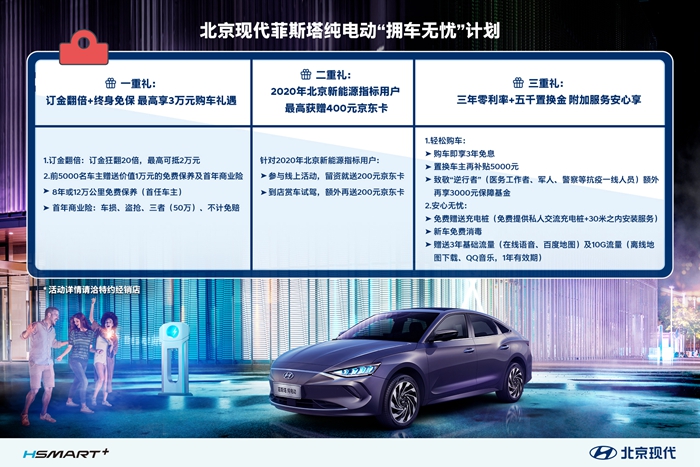 針對獲得2020年北京新能源指標(biāo)的準(zhǔn)車主,只要參與北京現(xiàn)代線上活動,留資并通過驗(yàn)證即可直接獲得200元京東卡;注冊會員并到店賞車試駕,還可額外獲得200元的京東卡,累計價值400元。此外,消費(fèi)者還可享受3年免息政策,而對于置換用戶來說,還可在此基礎(chǔ)上獲得5000元置換補(bǔ)貼。特別值得一提的是,為致敬抗擊一線的“逆行者”,包括醫(yī)務(wù)工作者、軍人、警察等還可額外享受3000元保障基金。