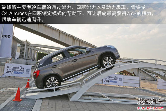 駝峰路主要考驗(yàn)車(chē)輛的通過(guò)能力、四驅(qū)能力以及動(dòng)力表現(xiàn),雪鐵龍C4 Aircross在經(jīng)過(guò)這一關(guān)考驗(yàn)時(shí)還是比較輕松的,當(dāng)然這得益于其四驅(qū)鎖定模式,該模式可讓后輪最高獲得75%的扭力,幫助車(chē)輛迅速爬升。