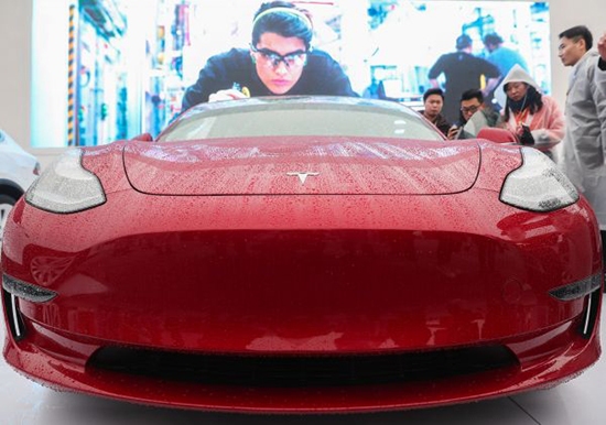 資料圖:人們?cè)谔厮估虾3?jí)工廠(一期)奠基儀式現(xiàn)場(chǎng)觀看展出的Model 3車型。 (新華社)