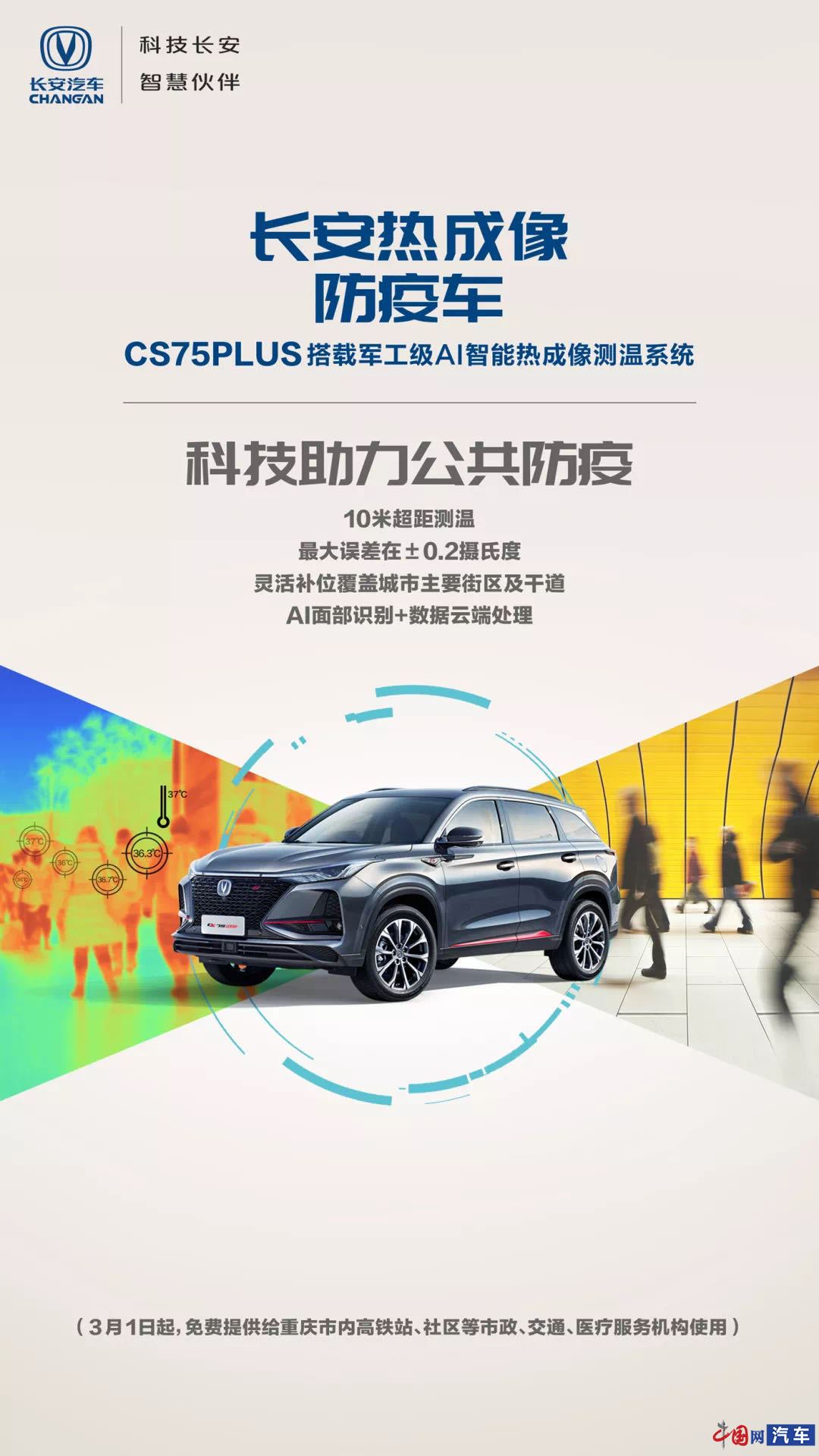 日前,長安汽車推出了熱成像防疫車——搭載軍工級AI智能熱成像測溫系統(tǒng)的CS75PLUS。并且自3月1日起,將免費(fèi)提供給重慶市內(nèi)高鐵站 、社區(qū)等市政、交通、醫(yī)療服務(wù)機(jī)構(gòu)使用。