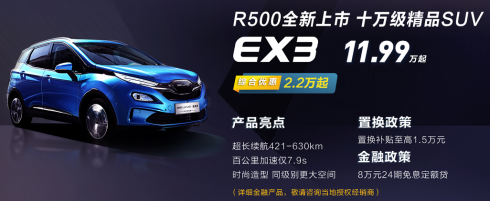 BEIJNG-EX3 R500是在EX3 R600車型基礎(chǔ)上,根據(jù)車主實際用車、消費場景進行優(yōu)化打造而來,工況續(xù)航達到421km,補貼后價格下探至11.99萬-12.99萬,是10萬級純電SUV最佳選擇。