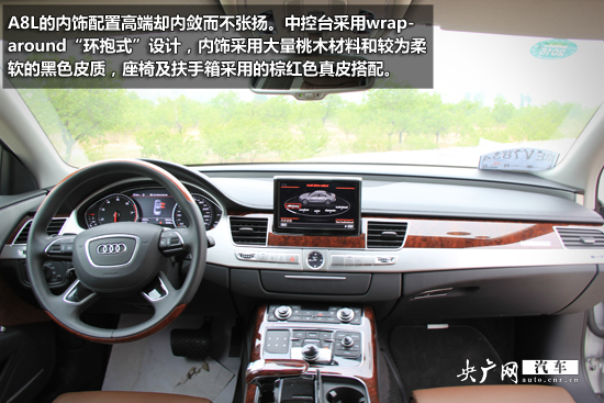 A8L的內(nèi)飾可謂精致典雅,配置高端卻內(nèi)斂而不張揚。中控臺采用wrap-around“環(huán)抱式”設計,內(nèi)飾采用大量桃木材料和較為柔軟的黑色皮質(zhì),座椅及扶手箱采用的棕紅色真皮搭配,為A8L營造出了的極為尊貴卻又不盛氣凌人的駕乘氛圍。