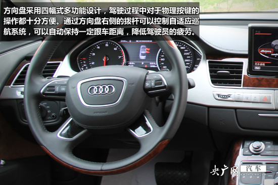 方向盤采用四幅式多功能設計,駕駛過程中對于物理按鍵的操作都十分方便。通過方向盤右側(cè)的撥桿可以控制自適應巡航系統(tǒng),A8L的自適應巡航系統(tǒng)作動速度區(qū)間是在0-250km/h,可以自動保持一定跟車距離,有效降低駕駛員的疲勞。