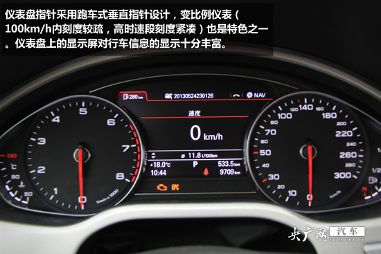 儀表盤指針采用跑車式垂直指針設計,變比例儀表(100km/h內(nèi)刻度較疏,高時速段刻度緊湊)也是特色之一。儀表盤上的顯示屏對行車信息的顯示十分豐富。