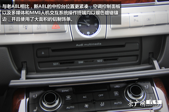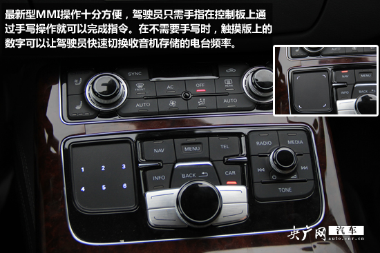 與老A8L相比,新A8L的中控臺位置更緊湊,空調(diào)控制面板以及多媒體和MMI人機交互系統(tǒng)操作終端均以銀色鍍鉻鑲邊,并且使用了大面積的鋁制飾條。最新型MMI操作十分方便,駕駛員只需手指在控制板上通過手寫操作就可以完成指令。而在不需要手寫時,觸摸版上的數(shù)字可以讓駕駛員快速切換收音機存儲的電臺頻率。而在需要手寫輸入時,觸摸板上的數(shù)字會消失,這時就可以直接在上邊寫字了。中控臺正中的時鐘非常精致,實用度也挺高。