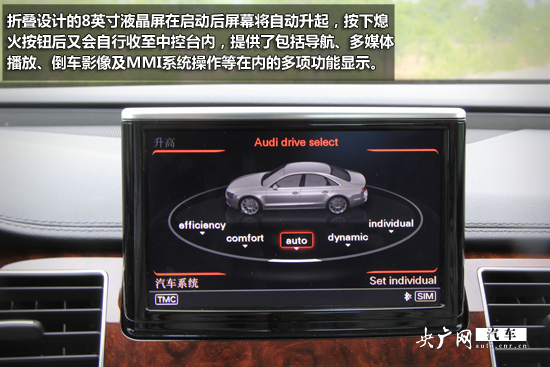 折疊設計的8英寸液晶屏在啟動后屏幕將自動升起,按下熄火按鈕后又會自行收至中控臺內(nèi),提供了包括導航、多媒體播放、倒車影像及MMI系統(tǒng)操作等在內(nèi)的多項功能顯示。