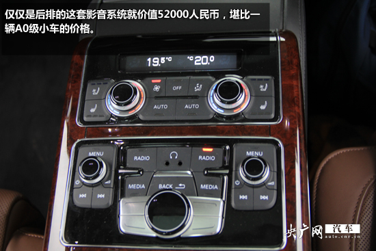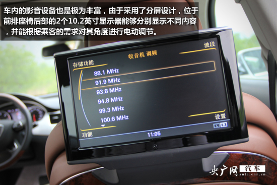車內(nèi)的影音設備也是極為豐富,由于采用了分屏設計,位于前排座椅后部的2個10.2英寸顯示器能夠分別顯示不同內(nèi)容,并能根據(jù)乘客的需求對其角度進行電動調(diào)節(jié),配合兩個獨立的耳機插孔,使后排乘客能互不影響的使用視聽系統(tǒng)。僅僅是后排的這套影音系統(tǒng)就價值52000人民幣,堪比一輛A0級小車的價格。A8L采用Bose環(huán)繞音響系統(tǒng),重低音效果極強。600瓦數(shù)碼功放、14聲道14喇叭、可讓駕乘者盡情沉醉于美妙的音樂聲中。