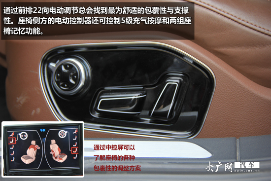 A8L的座椅采用了棕紅色的Valonea真皮制作,極為舒適。通過前排22向電動調(diào)節(jié)總會找到最為舒適的包覆性與支撐性。座椅側(cè)方的電動控制器還可控制5級充氣按摩和兩組座椅記憶功能。同時,通過中控臺上的相應按鍵也可以開啟座椅通風、座椅加熱功能。