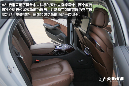 話說回來,對于A8L這樣一臺車,后排“老板座”上的配置顯得更為重要,畢竟擁有這款車的人更傾向于給自己配備一名司機而不是親自駕駛。A8L后排采用了具備中央扶手的雙獨立座椅設計,兩個座椅可獨立進行前后位置或俯仰角度的調(diào)節(jié),并配備了強度與模式組合可調(diào)的充氣按摩功能,前排擁有的加熱、通風和記憶功能也均一應俱全。