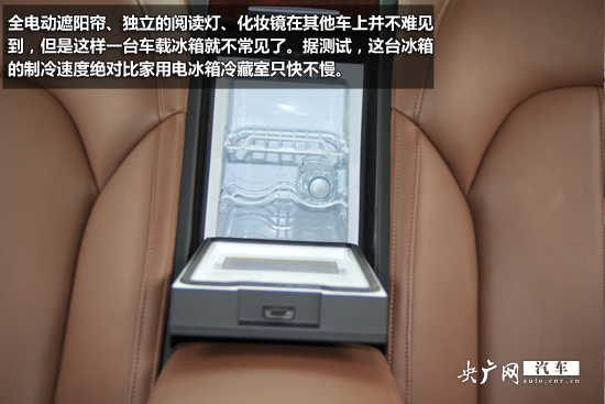 全電動遮陽簾、獨立的閱讀燈、化妝鏡在其他車上并不難見到,但是這樣一臺車載冰箱就不常見了。據(jù)測試,這臺冰箱的制冷速度絕對比家用電冰箱冷藏室只快不慢。