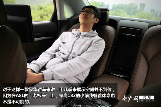 對于這樣一款豪華轎車來講,用幾拳來展示空間并不到位,因為在A8L的“老板座”上,身高182的小編我躺著休息也不是不可能的。雖然這樣的表現(xiàn)與同級別的其它競爭對手相較沒有突出優(yōu)勢,但足以令苛刻的老板們滿意了。