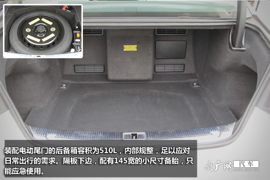 儲物方面,A8L的表現(xiàn)也相當優(yōu)異。車內(nèi)手套箱、前后扶手箱、門板儲物格等等一應俱全,儲物格內(nèi)也都會用軟膠或絨布鋪墊,減少噪音。裝配電動尾門的后備箱容積為510L,內(nèi)部規(guī)整,足以應對日常出行的需求。隔板下邊,配有145寬的小尺寸備胎,只能應急使用。