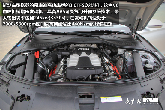 動力方面,試駕車型所搭載的是奧迪一款高功率版的3.0TFSI發(fā)動機,這臺V6直噴機械增壓發(fā)動機,具備AVS可變氣門升程系統(tǒng)技術(shù),最大輸出功率達到245kw(333Ps),在發(fā)動機轉(zhuǎn)速處于2900-5300rpm的寬泛區(qū)間內(nèi)可持續(xù)輸出440N?m的峰值扭矩。與發(fā)動機相匹配的是一款源自德國采埃孚(ZF)提供的Tiptronic八速手自一體自動變速器,擁有7.0:1總齒輪比,每個檔位的排列都極為緊密,在帶來極佳的換檔平順性的同時,大大降低了能量損耗。