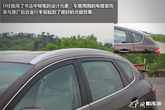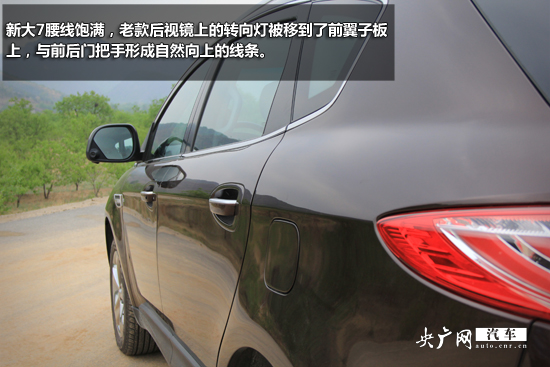 新大7腰線飽滿,老款后視鏡上的轉(zhuǎn)向燈被移到了前翼子板上,與前后門把手形成自然向上的線條。D柱借用了書法中頓筆的設(shè)計元素,車窗周圍的電鍍裝飾條與原廠鋁合金行李架起到了很好的點綴效果。