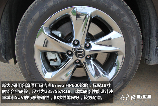 新大7采用臺灣原廠瑪吉斯Bravo HP600輪胎,出廠標配18寸的鋁合金輪轂,輪胎尺寸為235/55/R18。此款輪胎性能設(shè)計注重城市SUV的行駛舒適性,排水性能良好,較為耐磨。