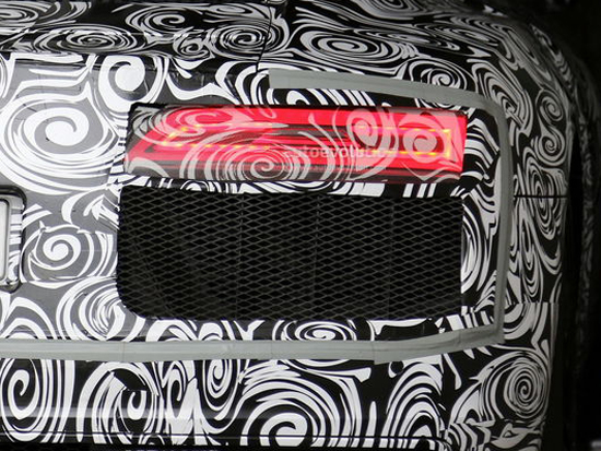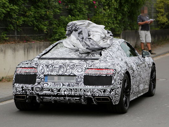 從測試車的外觀來看,新一代R8在外觀設計上使用了全新的元素:全新的頭燈設計,頭燈的形狀與TT一樣變得非常銳利;中央進氣格柵同樣變?yōu)閹в袖J角的六邊形造型。新一代R8的側面比例造型與現(xiàn)款車型相近,同樣在車門后方有為中置引擎提供散熱的通風孔,但車尾卻完全不同。尾燈使用了類似于現(xiàn)款車型的設計,但尾燈的造型同樣變得更為平直,尾燈毫無疑問由LED發(fā)光元件組成,開口向上的“C”形LED燈帶環(huán)繞尾燈一周。在尾部下方則是大面積的擴散器和方形的雙邊雙出排氣尾喉。