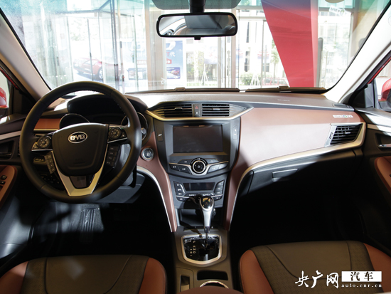 內(nèi)飾方面,比亞迪G5使用了較多軟性材料,棕紅色與灰黑色的雙色搭配也較顯檔次。多功能方向盤上物理按鍵不少,功能也較為豐富,不僅可以調(diào)節(jié)播放系統(tǒng),而且可以對(duì)倒車影像的視角進(jìn)行選擇。另外,該車還裝配了雙炮筒加液晶屏形式的儀表盤和8寸液晶屏幕。