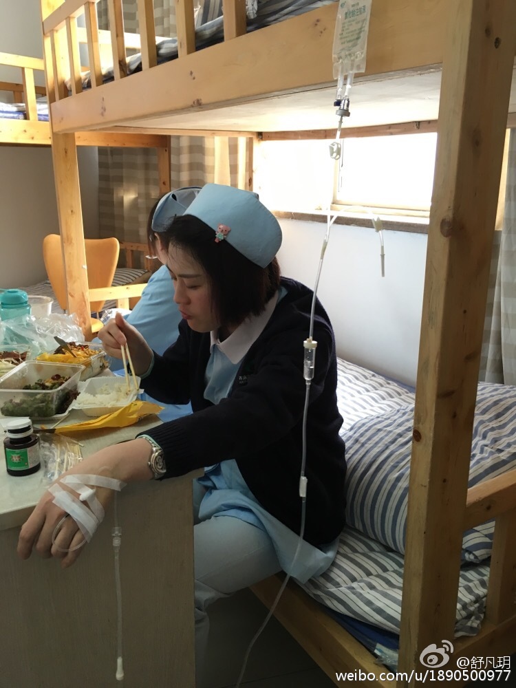 3月28日,網(wǎng)友“舒凡玥”通過(guò)微博上傳了一張照片,照片上,一位年輕女護(hù)士在醫(yī)院值班室內(nèi)一邊吃飯一邊輸液。“舒凡玥”表示:好艱辛,吃飯時(shí)間趕著給自己輸液,然后還要繼續(xù)上班。照片很快被網(wǎng)友轉(zhuǎn)發(fā)了出去,獲得不少網(wǎng)友點(diǎn)贊。