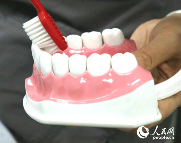 李秀紅提到,正確的刷牙方法是牙齒清潔最重要的一點(diǎn)。目前常推薦的刷牙方法是改良貝氏刷牙法,即上下牙分開刷,刷下牙時(shí)牙刷毛朝下,刷上牙時(shí)牙刷毛朝上。“刷的時(shí)候牙刷毛放在牙齦與牙齒交界的位置,與牙齒呈45度角,刷毛橫向短距離移動(dòng),每次2-3顆牙,來回刷約15下,再向上挑出牙縫中的污物。刷前牙內(nèi)側(cè)面時(shí)可以把牙刷豎起來刷。刷牙順序由后牙向前刷,先刷兩側(cè)再刷咬合面!崩钚慵t向記者介紹。