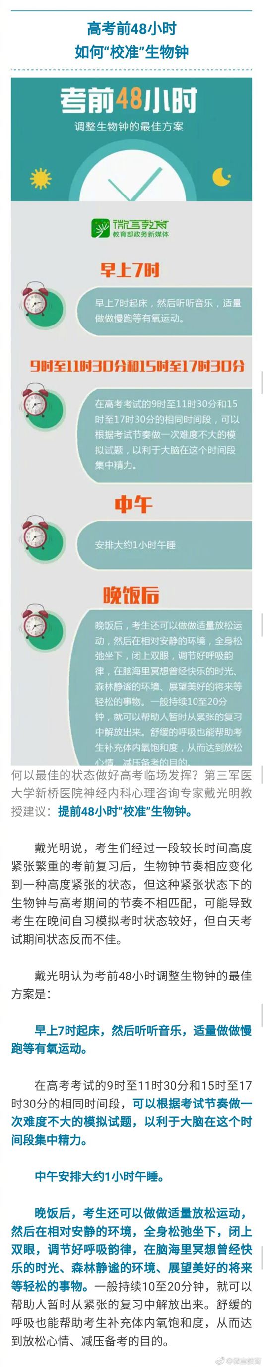 中新網(wǎng)5月26日電 據(jù)教育部新聞辦公室官方微博消息,還有十來(lái)天就要高考了,考生們?cè)谧铌P(guān)鍵的沖刺階段如何安排飲食、作息?家長(zhǎng)們又該如何做好心理調(diào)節(jié),給孩子們營(yíng)造一個(gè)寬松舒適的情緒環(huán)境,讓考生以最健康的生活狀態(tài)、最輕松的心理狀態(tài)走上考場(chǎng)?詳情戳圖>>