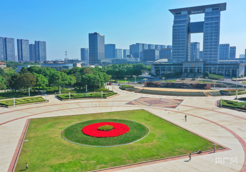 銅文化園中心廣場(chǎng)擺放的花壇與藍(lán)天相映成景。(央廣網(wǎng)發(fā) 高凌君 攝)