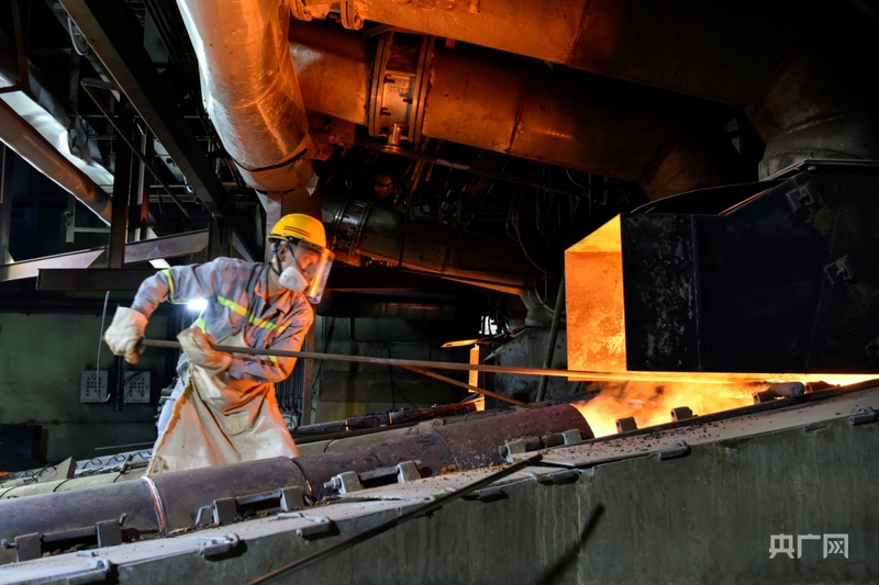 銅陵有色金冠銅業(yè)分公司雙閃冶煉車間閃速熔煉爐旁,爐前作業(yè)人員正在頂著熱浪有序進(jìn)行放渣作業(yè)。(央廣網(wǎng)發(fā) 儲(chǔ)著傳 攝)