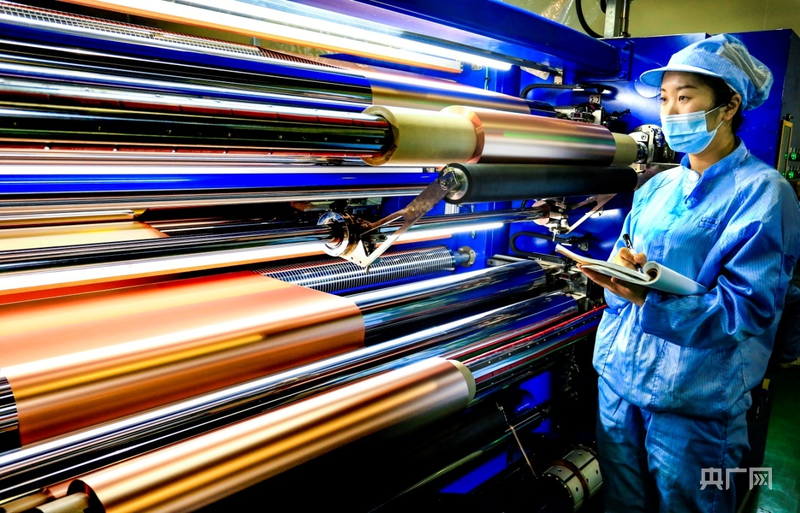 銅陵銅冠電子銅箔有限公司分切車間,工人正在仔細(xì)檢查成品切邊、銅箔表面等外觀并做好巡檢記錄。(央廣網(wǎng)發(fā) 高凌君 攝)
