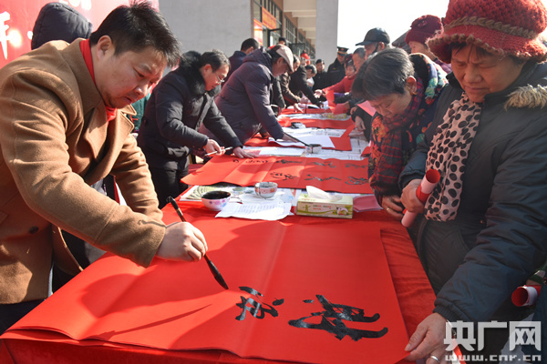 活動(dòng)現(xiàn)場,書法老師和書法愛好者們現(xiàn)場書寫春聯(lián),“民生政策好、幸福萬年長;民生暖人心、歡樂賀新春;民生暖民心、春聯(lián)賀新年;民生年年好、生活步步高”等一幅幅寄托新春祝福、反映民生政策的春聯(lián)送到居民手中。