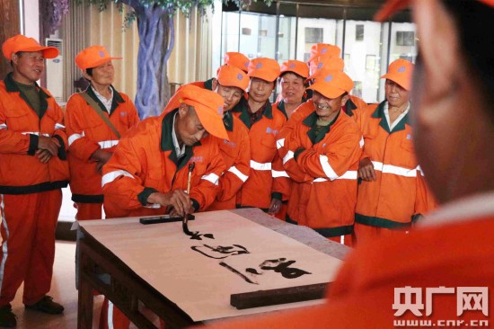 與此同時,環(huán)衛(wèi)工人們還在書法家的指導(dǎo)下,進(jìn)行了書法體驗,并欣賞京劇《打虎上山》、《黃梅戲聯(lián)唱》、川劇變臉等表演!肮(jié)目很精彩,景色也很美。這是我第一次來這里,感謝對我們的關(guān)心!杯h(huán)衛(wèi)工人黃先得說道。