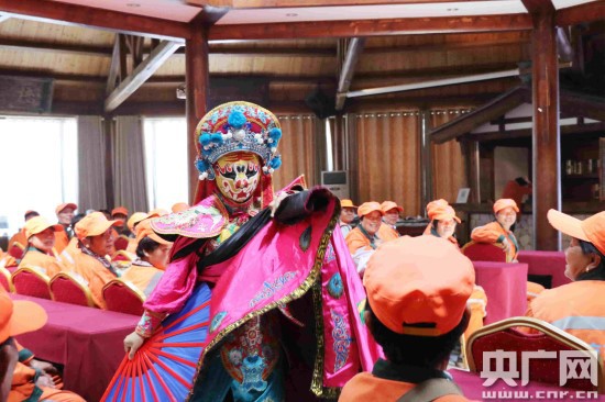 環(huán)衛(wèi)工人欣賞川劇變臉表演