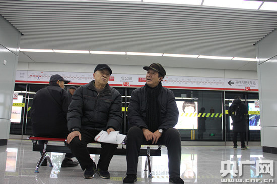 12月16日上午,兩位市民在合肥地鐵一號線包公園站排隊等候第一列車的到來。