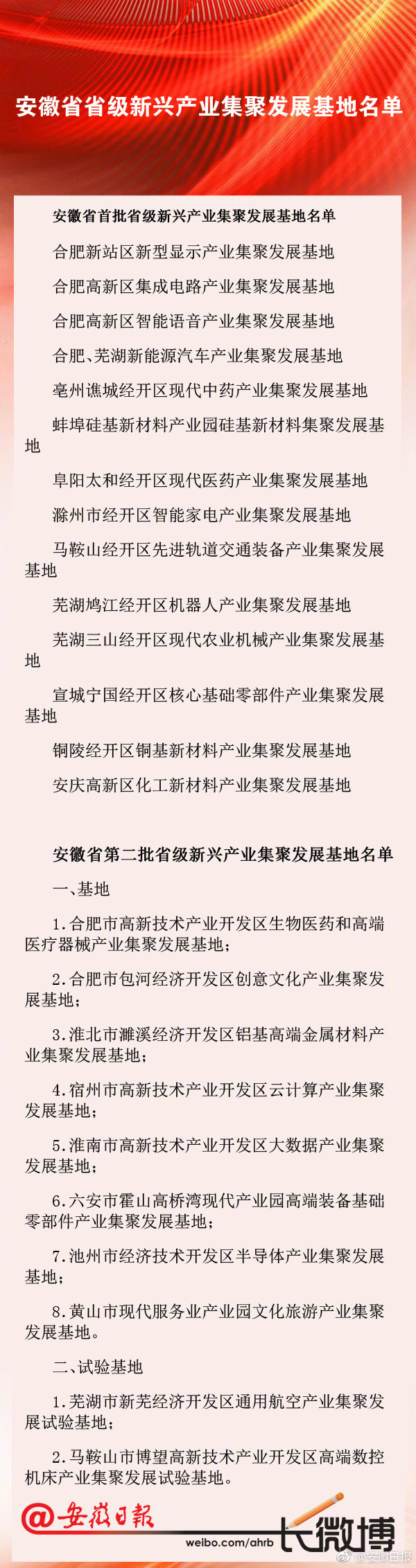 安徽全力推進省級戰(zhàn)略性新興產業(yè)集聚發(fā)展基地建設。2015年,安徽省政府確定了第一批省級戰(zhàn)略性新興產業(yè)集聚發(fā)展基地,合肥新站區(qū)新型顯示產業(yè)集聚發(fā)展基地等14家入圍。2016年,省政府確定第二批10家戰(zhàn)略性新興產業(yè)集聚發(fā)展基地,其中基地有8家,試驗基地有2家。目前,安徽省戰(zhàn)略性新興產業(yè)集聚發(fā)展基地共有24家。