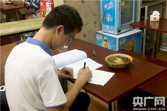 央廣網(wǎng)記者走近后發(fā)現(xiàn),該男生正在做高一數(shù)學(xué)函數(shù)題?v使一碗熱騰騰的面湯已經(jīng)擺在面前,但他似乎依舊沉浸在題海之中,奮筆疾書地算著題目。不少食客見此情景后,都稱其為“一股清流”。