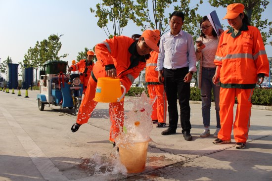 活動現(xiàn)場,環(huán)衛(wèi)班長劉友珍和隊友參加了“新鐵人三項”活動。記者看到,兩人綁腿進(jìn)行兩人三足行進(jìn),手里各自提一桶水,盡量保持平衡到達(dá)終點后,將水放上電動三輪車,一人騎行繞S彎通過十余個安全錐,行進(jìn)中撿拾5個路面瓶蓋,并保持水不潑灑,第二人在終點等待,用兩桶水將一空桶內(nèi)乒乓球沖出桶。