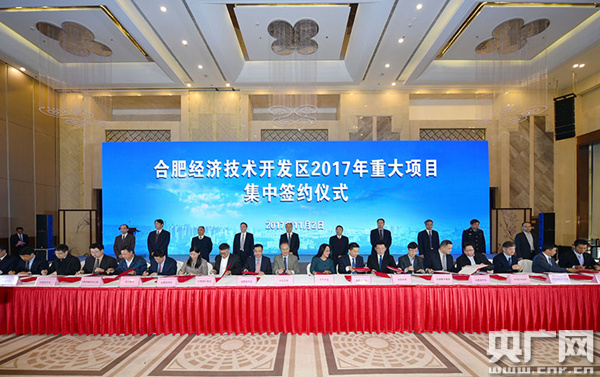 央廣網(wǎng)合肥11月2日消息(記者徐鵬 通訊員章玉龍 李長(zhǎng)龍)11月2日上午,合肥經(jīng)開(kāi)區(qū)舉行2017年重大項(xiàng)目集中簽約暨集中開(kāi)工儀式,53個(gè)重點(diǎn)項(xiàng)目集中簽約、集中開(kāi)工,涵蓋家電、汽車(chē)、電子信息、現(xiàn)代服務(wù)業(yè)等產(chǎn)業(yè),總投資697.79億元。