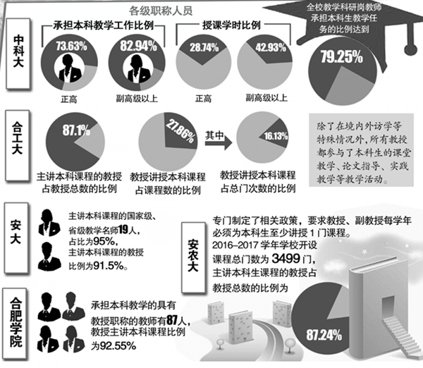 據(jù)安徽商報報道 省教育廳日前公布高校 2016-2017學(xué)年本科教學(xué)質(zhì)量報告。通過報告可以看出,大學(xué)教授們承擔(dān)本科教學(xué)工作的比例多在八成以上。