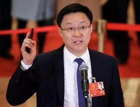 手持訊飛翻譯機(jī)的劉慶峰在今年全國(guó)“兩會(huì)”代表通道